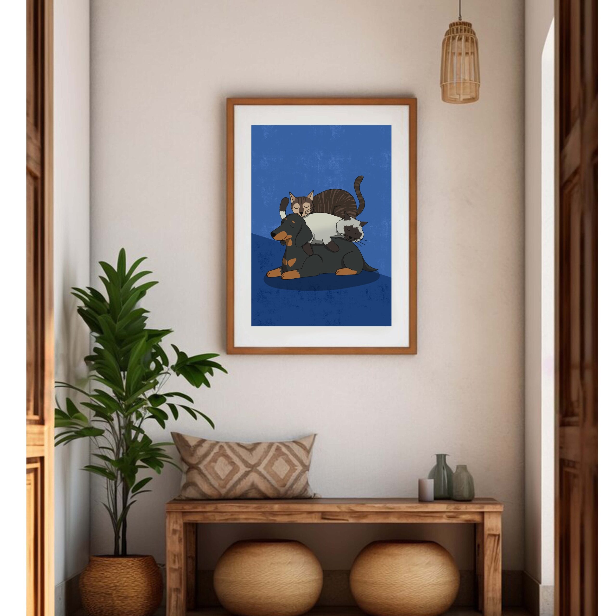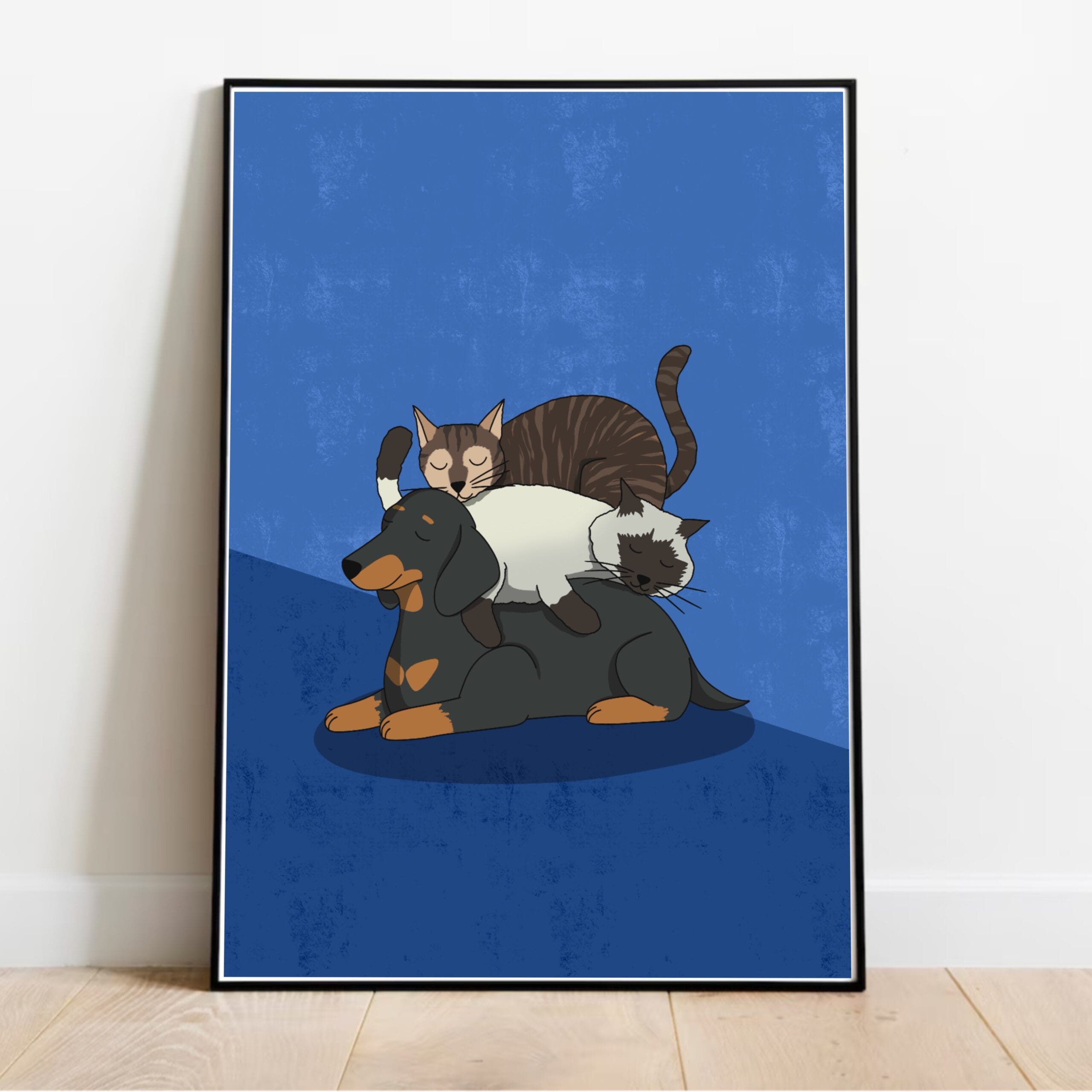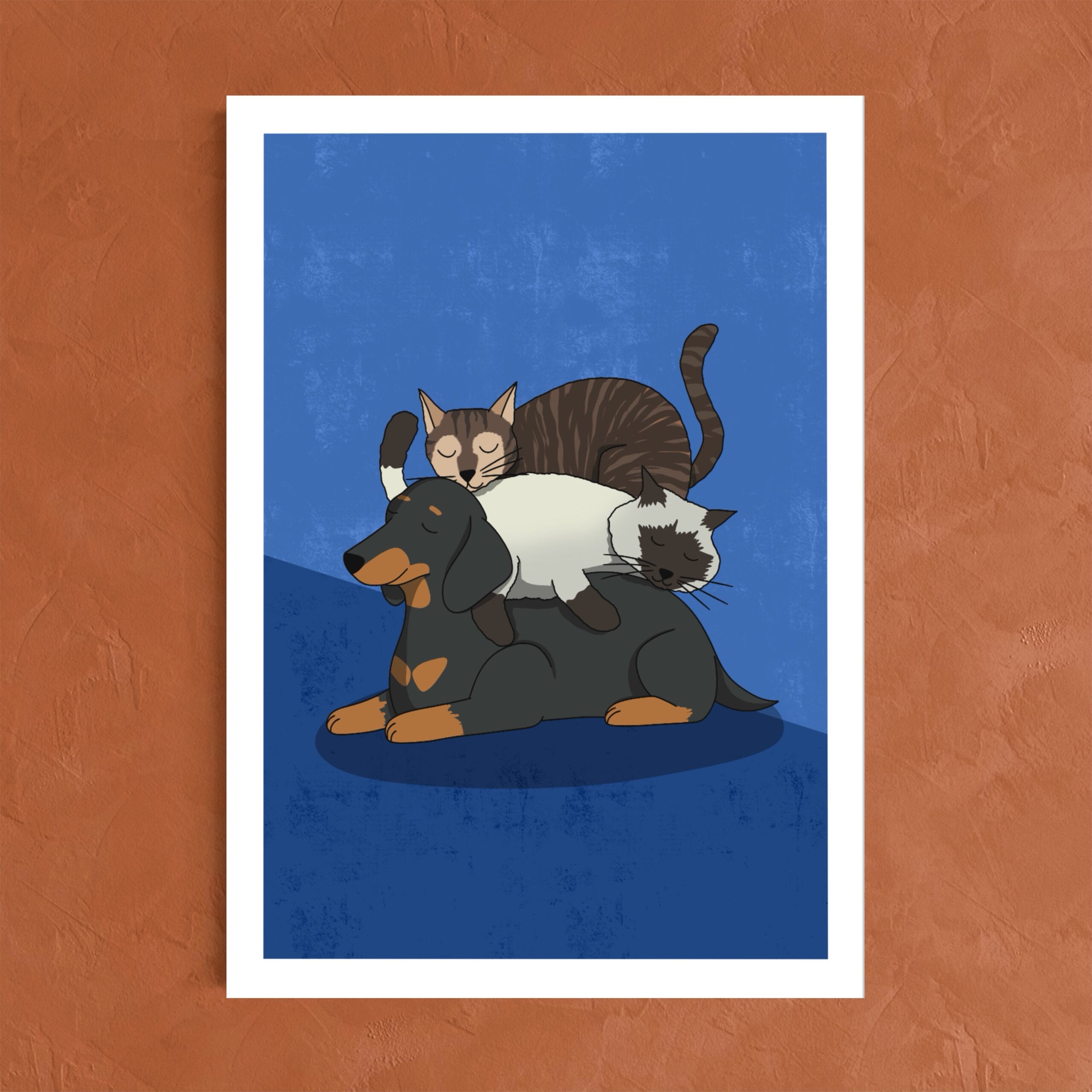 Poster « Nap Time », trois animaux qui dorment les uns sur les autres. Sieste d’un teckel et de deux chats.